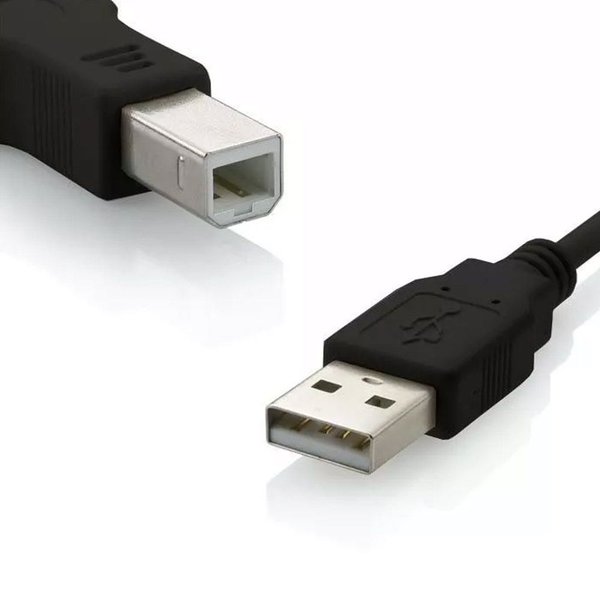O cabo apresenta conectores macho USB A 2.0 em uma extremidade e macho USB B na outra extremidade.